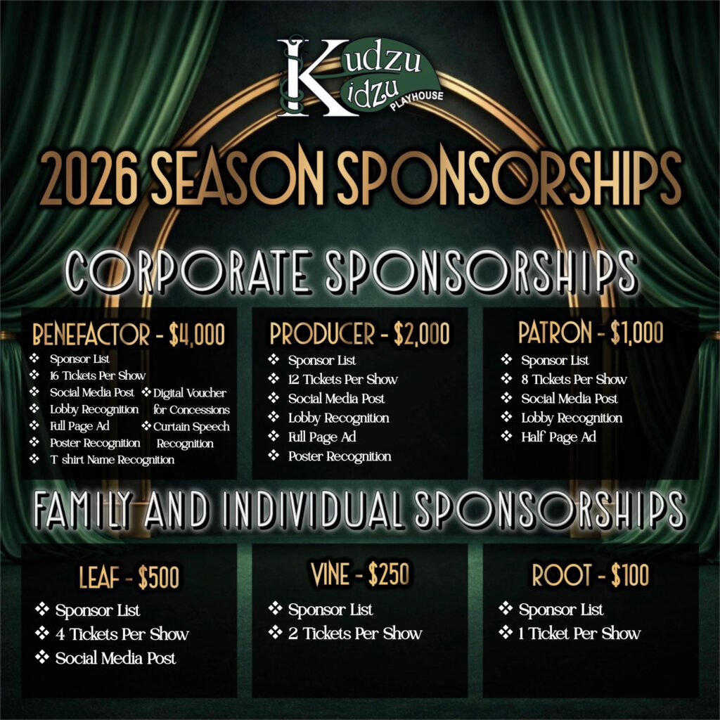 At Kudzu Playhouse, we believe theatre is for everyone. From first-time performers to seasoned artists, our stage is a place where creativity thrives, confidence grows, and community comes together. Our productions bring people of all ages together to tell powerful stories, celebrate diverse voices, and create meaningful connections, both on and off the stage.